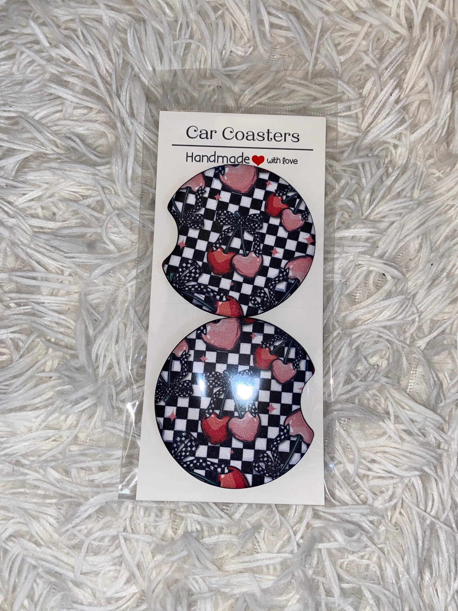 Checker Heart Cherries Seamless Print Car Coaster Set