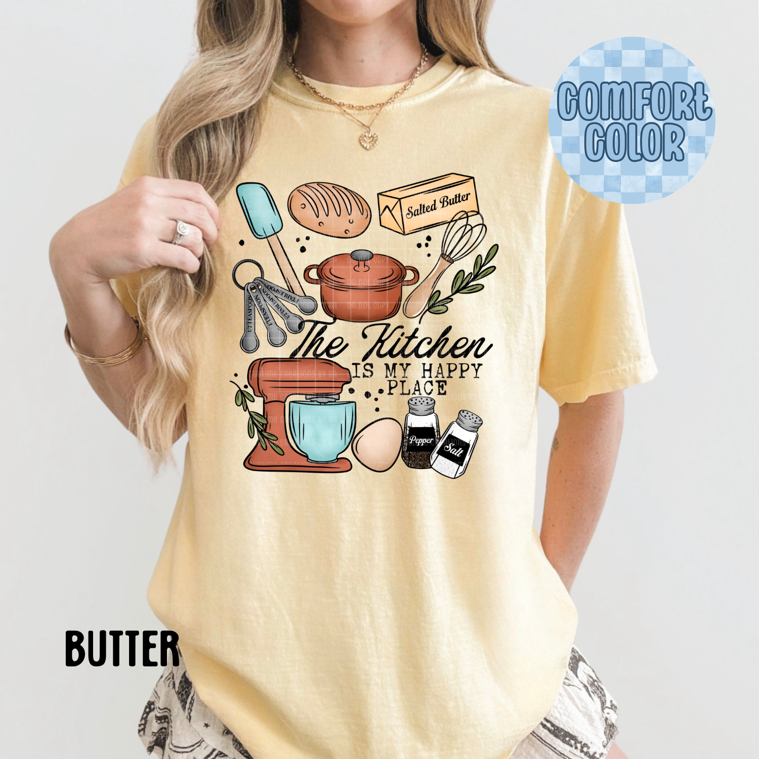 If cooking, baking, or just hanging out in the kitchen brings you joy, this tee is for you 🤍 The “The Kitchen Is My Happy Place” graphic tee is cozy, simple, and perfect for everyday wear. Whether you’re whipping up family dinners, baking on the weekends, or just love that warm kitchen vibe, this shirt says it all.